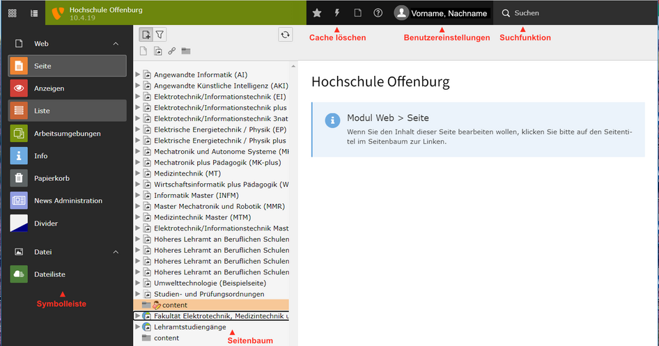 Nachdem Sie sich bei Typo3 angemeldet haben, wird Ihnen das sogenannte Backend der Webseite angezeigt, also die Arbeitsumgebung, in der Sie Änderungen an den Inhalten der Webseite vornehmen können: