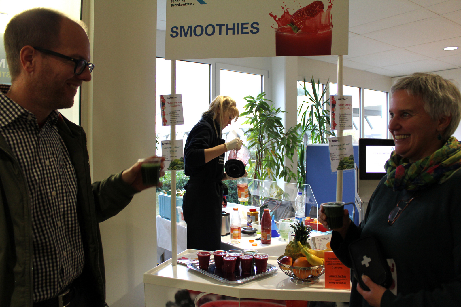 Im A-Gebäude freuten sich Mitarbeiter der Hochschule Offenburg wie Studenten über die kostenlosen Smoothies am Stand „Thementag Trinken“ und viele nützliche Informationen, die von der Techniker Krankenkasse dort angeboten wurden. Auch zu den Screenings kann man sich dort noch anmelden. Diese dauern rund 15 Minuten. Dabei werden Körperfettanteil, Gewicht, Flüssigkeitshaushalt, Blutdruck und BMI gemessen.