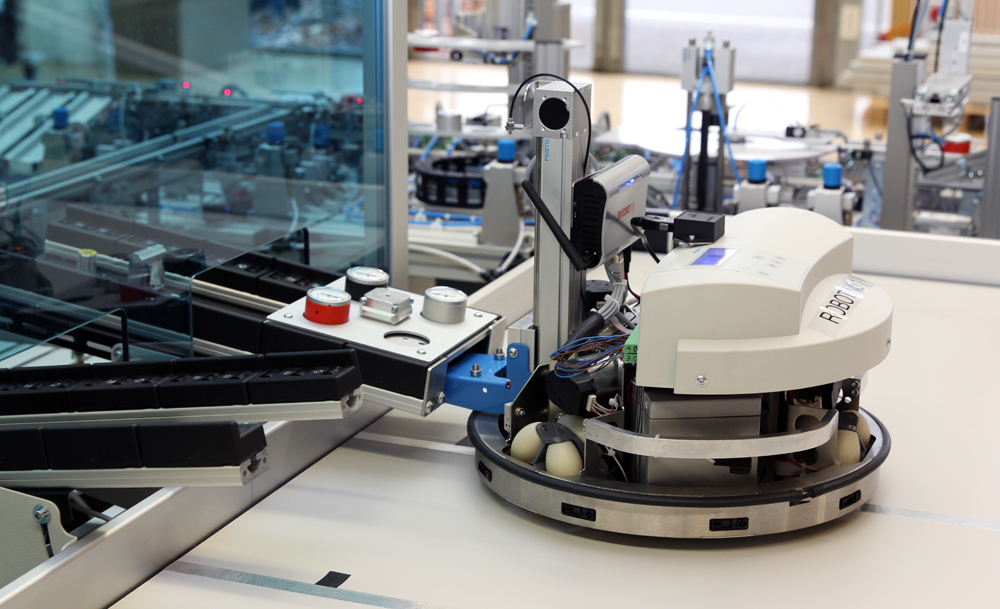 Für die Lehre in den Mechatronik-Studiengängen stehen die mechatronischen Produktionsstationen, der Kommissionierroboter und die Mobilroboter für den Lagerbetrieb im Vordergrund. Im Einzelnen gibt es mechatronische Produktionsstationen für den Wareneingang ("Stapelmagazine"), zur Kontrolle der Teile ("Prüfen"), zum Einsetzen von einem zweiten Teil ("Pick-and-Place"), zum Einpressen des Teils ("Fluidmuskel-Presse") und zum Lagern der Einzelprodukte ("Lagern"). Anschließend werden die Produkte je nach vorliegendem Auftrag der Kommissionierstation zugeführt oder ausgesondert ("Trennen"). Die ausgesonderten Produkte werden nach der Farbe gruppiert ("Sortieren"). Jede der Stationen besitzt eine Reihe von Sensoren und Antrieben, die von einer speicherprogrammierbaren Steuerung ("SPS") genutzt werden, um einen koordinierten Ablauf zu erreichen. In den meisten mechatronischen Produktionsstationen werden auch pneumatische Komponenten wie Ventilinseln und pneumatische Zylinder verwendet.
