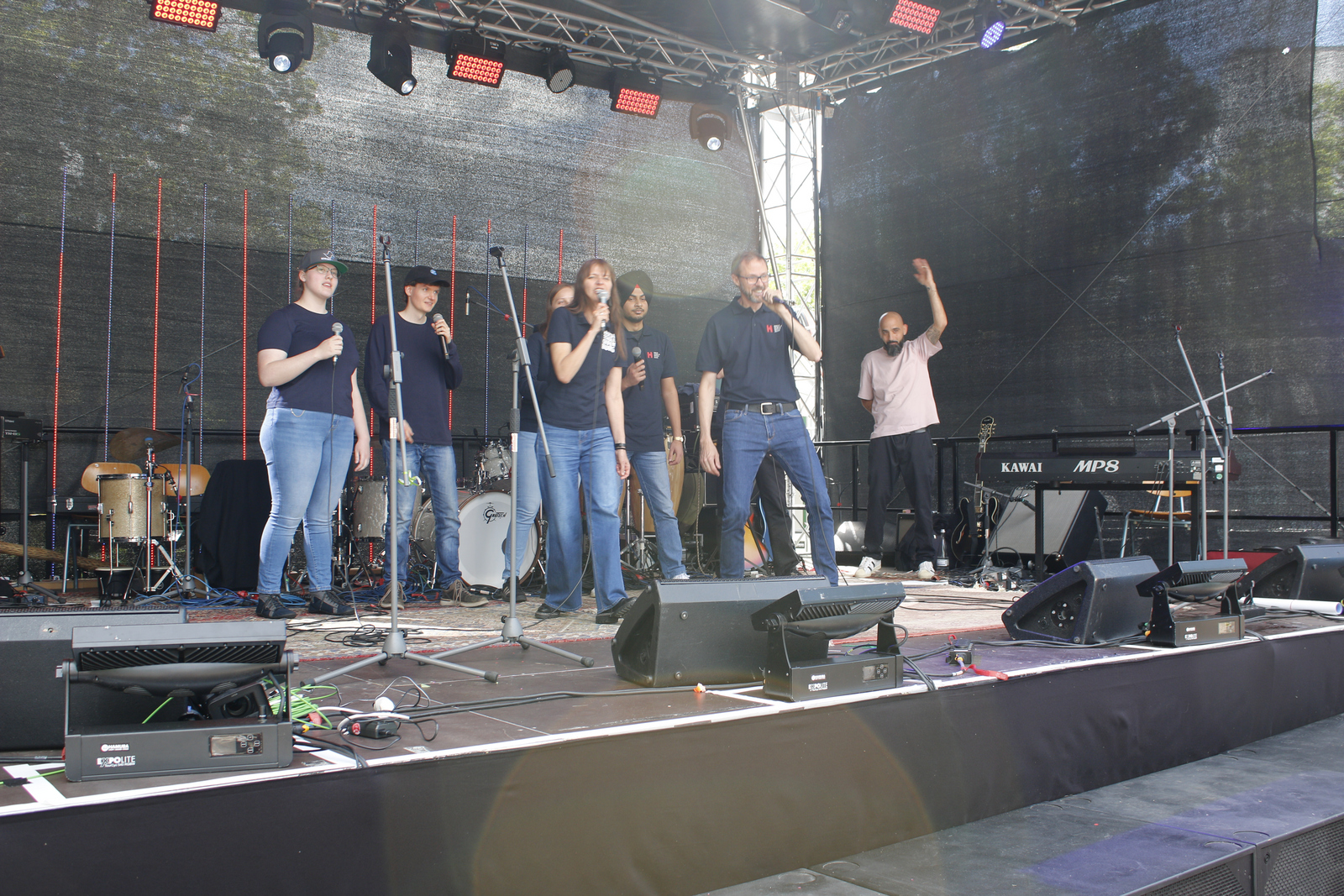 Und auch auf der Bühne herrschte weiter viel Bewegung. Im Rahmen des Talks zum Thema Nachhaltige Mobilität am Oberrhein ging es neben ÖPNV und Car-Sharing auch um eine Challenge zwischen E-Bike und Fahrrad, zu der Student Joshua Lequen und Prof. Manuel Lämmle antraten. Anschließend begeisterten die Professoren Dominik Giel und Dragos Saracsan mit „Physik ist wenn’s knallt – Experimente aus sechs Jahrzehnten Hochschule“ das Publikum, das von einigen ehemaligen Studierenden aus den 60er-Jahren bis hin zu kleinen Nachwuchsforscherinnen und -forschern reichte. Bei einem von Claudio Esposito und Hochschulangehörigen erarbeiteten Rap und Tanzvorführungen der Internationalen Studierenden durfte am Ende auch das Publikum auf die Tanzfläche. Und wie vielfältig und unterhaltsam die Wissenschaft an der Hochschule Offenburg sein kann, zeigten die Professorinnen und Professoren Melanie Broszat, Klaus Dorer, Oliver Korn und Daniel Kray in ihrem Science Slam, den Melanie Broszat mit ihrer „Underdog Story“ gewann. Den Schlusspunkt bildete dann ein Konzert der Studierendenband der Hochschule Offenburg, zu der sich im Verlauf Thomas D von den Fantastischen Vier, Komponist Leonard Küßner sowie Musikerinnen und Musiker der Musikschule Offenburg gesellten. Gemeinsam präsentierten sie das klangvolle Ergebnis eines mit viel Liebe und Leidenschaft gefüllten Workshops im Vorfeld von Open Campus. Mit einem Set von DJ Marius Müller und einer Lichtprojektion von Marco Kornke klang die vom VdF sowie von Badenova, BSW, Edeka, hansgrohe, Herrenknecht, HIWIN, Hobart, Huber, Hubert Burda Media, Koehler Group, Markant, Meiko, Printus, Sparkasse Offenburg/Ortenau, SWEG, Techniker Krankenkasse und Vega unterstützte Veranstaltung schließlich aus.