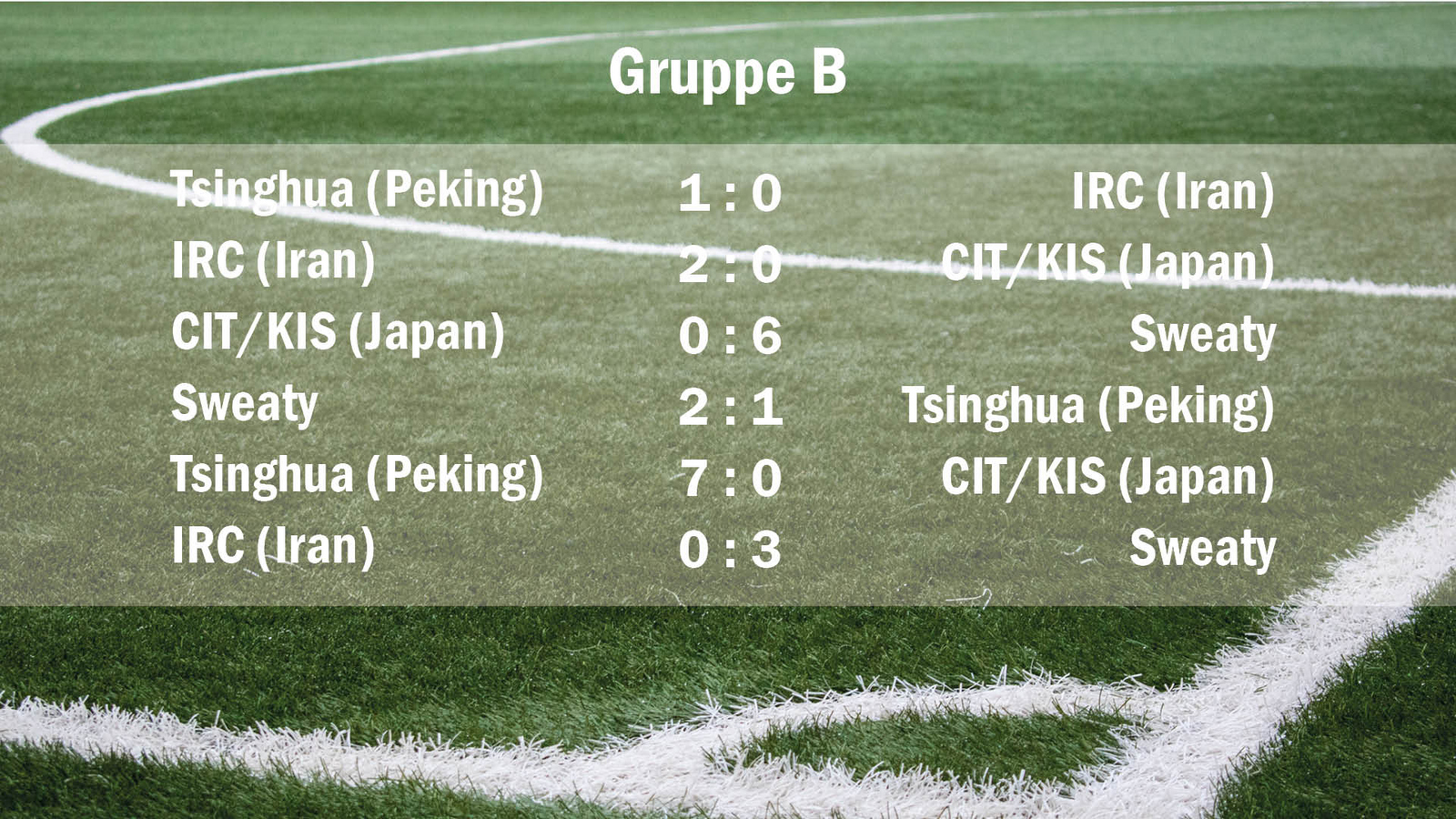 In der Gruppe B dürfte es spannender werden: Tsinghua (Peking) spielt mit zwei mechanisch herausragenden Robotern (davon einer in Reserve), IRC (Iran), der Vorjahresdritte, und CIT/KISS (Japan) ebenfalls mit zwei Robotern und Sweaty.